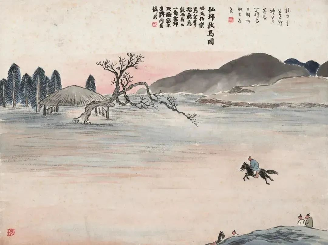 《石门二十四景》共24幅,图卷采用生活中最平常的风景、最简单的事物、最普通的生活为题材,此凡间寻常景色在齐白石的笔下却显得妙趣横生,登高访友、老屋听鹂、藕池观鱼、蕉窗听雨、湖桥泛月,一幅幅诗意延绵的神奇画作,荡漾纸上,真可谓是匠心独运,妙笔生花。