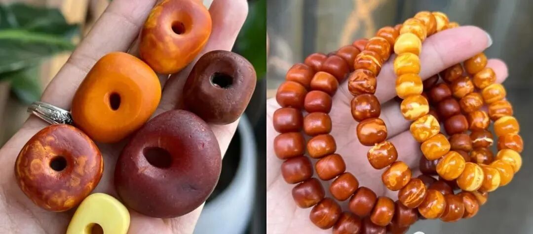 你有没有过花了成千上万买老蜜蜡结果买一个烤色蜜蜡的经历?两三百年前的老蜜蜡大多是饼子型或者枣珠的,而市面上的老型、直切、红桶、妖花这些分明就是现代制型工艺的烤色蜜蜡,就算两三百年前真的有,能有几颗,可能一串串一堆堆的出现吗?这种蜜蜡也不是不能买,毕竟搭配手串的确是好看,但不能当老蜜蜡买,不能用太高的价格去买。
