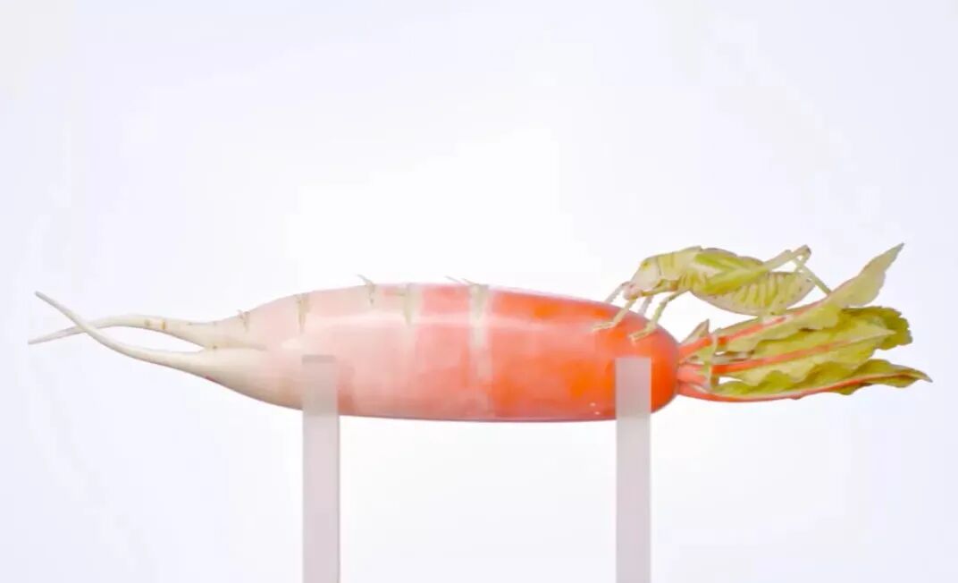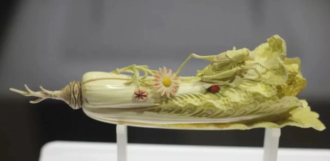 水灵灵的象牙萝卜,须上刻画出没洗干净的泥土,萝卜叶上趴着一只蝈蝈,连其腿上的绒毛都表现得非常真实。