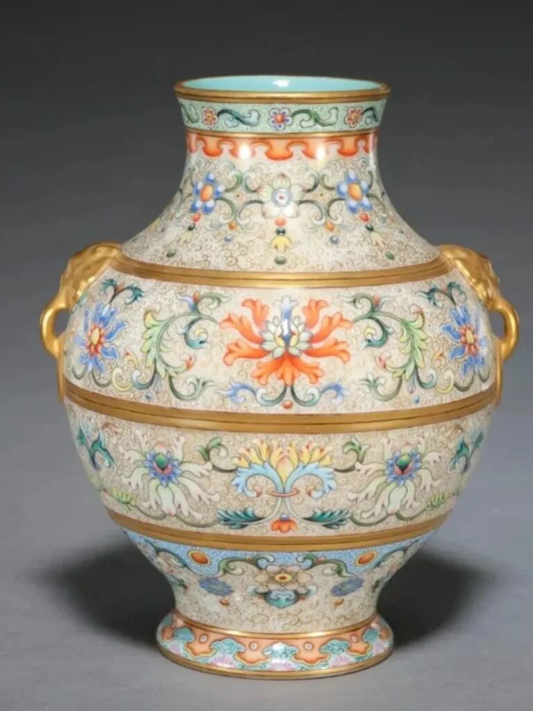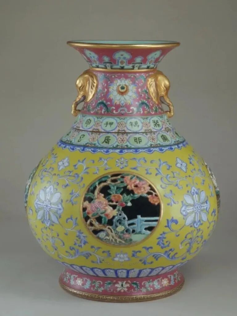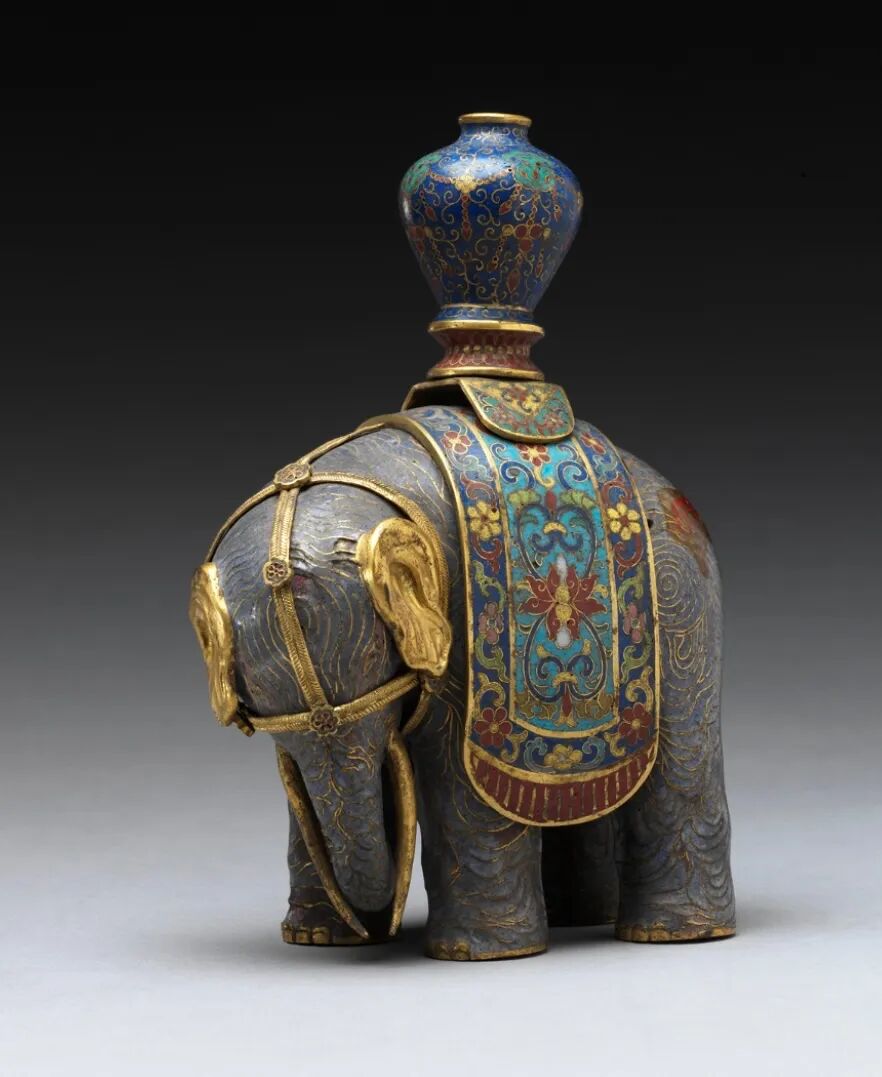 这款珐琅器就是一个非常经典的“象背托宝瓶”的太平有象式样。大象看起来祥和庄重,装饰繁冗精致,尽显太平盛世之气韵。