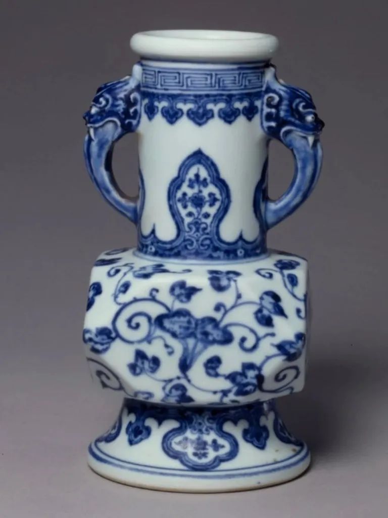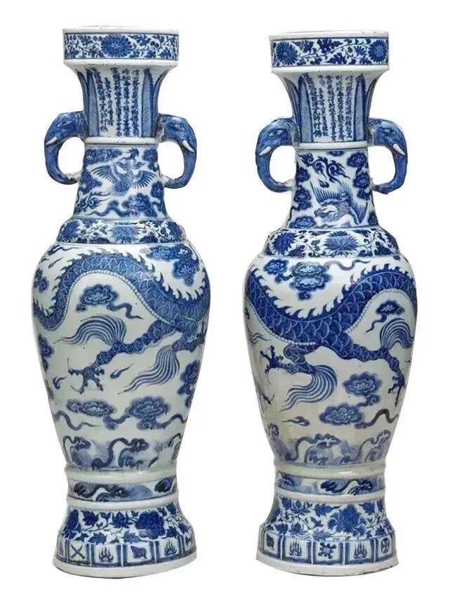 象耳瓶最早见于元代景德镇窑,其中,最著名的象耳瓶是元至正十一年铭青花云龙纹象耳瓶,这对象耳瓶是元青花断代的标准器,对元青花的研究有着至关重要的意义。