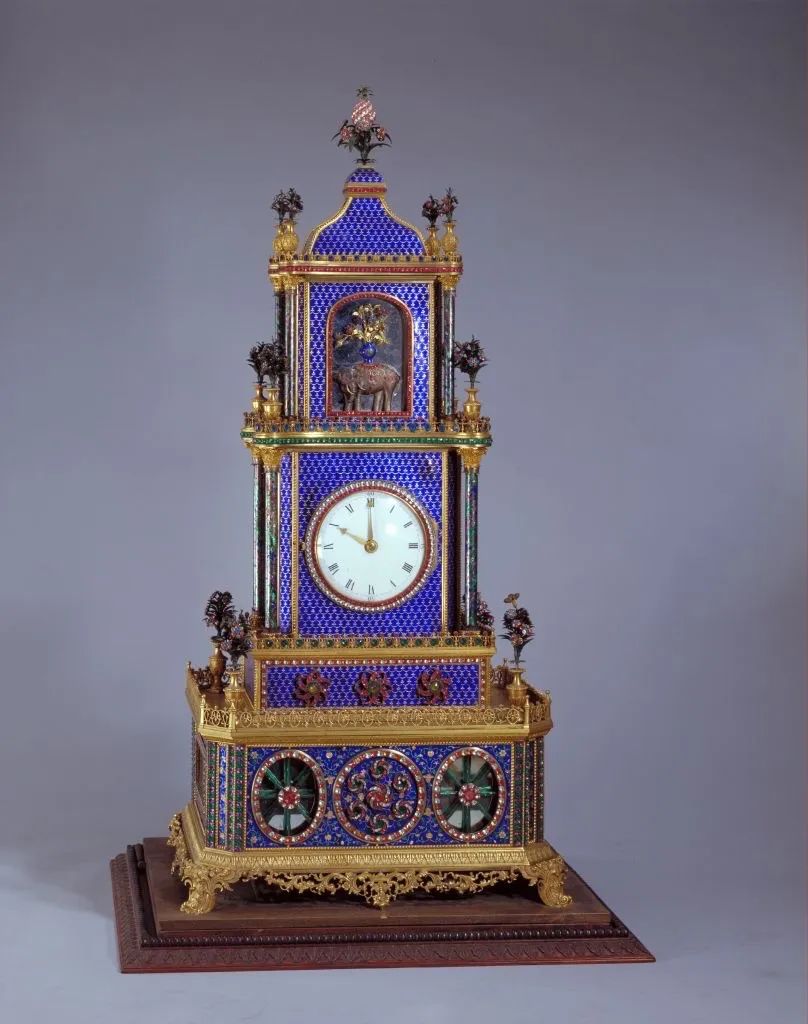 此钟为四层钟楼式,机械部分为两个各自独立的系统:一个是计时系统,另一个是表演系统。启动表演系统的机械装置后,钟表会发出优美的乐声,每一层的机关都会开始运转,第四层的大象尤为精巧生动,鼻子会上下翻卷,尾巴则来回摆动。