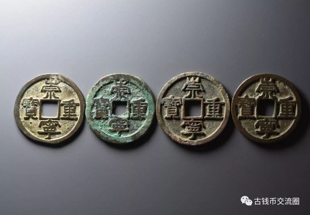 北宋时期的钱币,被世人公认为中国铸币史上四个高峰期之一。它从币材、铸造工艺、钱文、版别到合金配比等方面,均达到了巅峰,而此时期最有代表性的又首推崇宁通宝。崇宁元宝钱有楷书、隶书、篆书三种书体,皆为旋读。分铜、铁二种,有小平、折二两等。崇宁元宝钱铸量很少,今天不多见。崇宁重宝钱文古朴方正,严谨庄重,为隶书书写、对读,折十型制。重宝版别几百种,面背记号多。