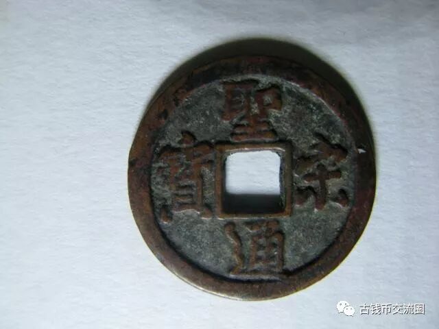 圣宋通宝是宋徽宗赵佶建中建国元年(公元1101)年铸,材质有铜铁二种,大小分小平,折二。钱文有篆书,行书,隶书。且篆,行成对,不乏珍罕版品。“圣宋通宝”四字行书旋读,字体与行书圣宋元宝相同,是是“元”作“通”。背右下角现一斜月,左侧边郭有一个直径0.1厘米的圆形深孔,形态较规则,似乎是用作定位用。宋徽宗赵佶于崇宁二年(1103年)铸圣宋通宝,行、篆二体,以一当五,崇宁三年(1104年)乃止。