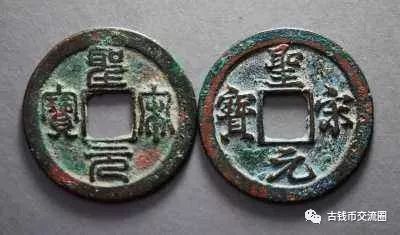 圣宋元宝钱,北宋徽宗(公元1101年)铸币。版式较多,书体篆、行、隶,铜铁兼铸。阅谱可知,载有圣宋元宝钱几种书体的铁母,形制如折三大小,是圣宋元宝钱中最为精美和珍贵的品种。其中的隶书铁母,从谱载拓图的质量亦可知其精美无比,是为宋钱中的佼佼者之一。圣宋元宝有小平和折二两种,理论上来讲,它只是在临时铸造的,后一年的年号即为崇宁,应该铸造崇宁通宝。但是从钱币的存世量来看,崇宁通宝折十的极多,而崇宁小平钱很少,这是反常的现象。再结合圣宋元宝存世量极多的现状,我们有理由相信,圣宋通宝不止建中靖国一年的铸造期。很可能一直铸造到崇宁期,直至被大观通宝小平取代。