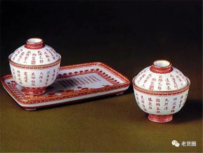 这件清乾隆御制诗款茶具,有两个盖茶碗,一个茶盘。造型端庄规整,制作均甚精致。盖碗、茶盘精美纤巧,令人爱不释手。诗词装饰,以红彩楷书书写,
