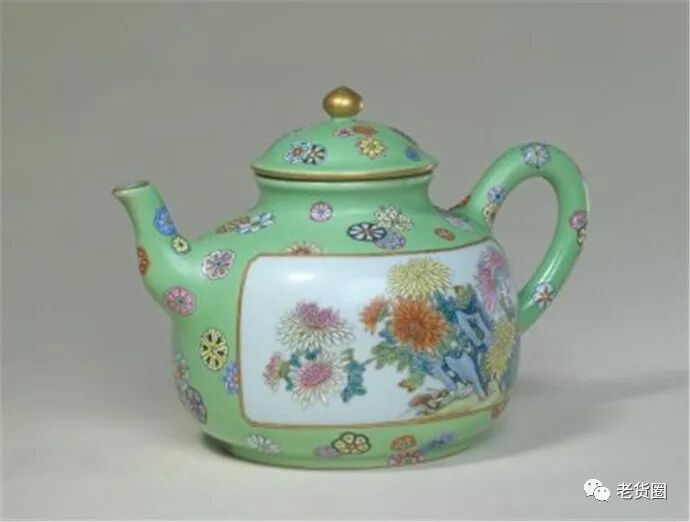 清乾隆 绿地粉彩开光菊石纹茶壶