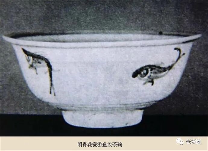 明代景德镇民窑青花瓷碗,是古代饮茶用具,它的造型与胎釉制作不像官窑那样精致细腻,光洁漂亮。但民窑青花瓷的重要特色在于别树一帜的绘画。此瓷碗上的游鱼,