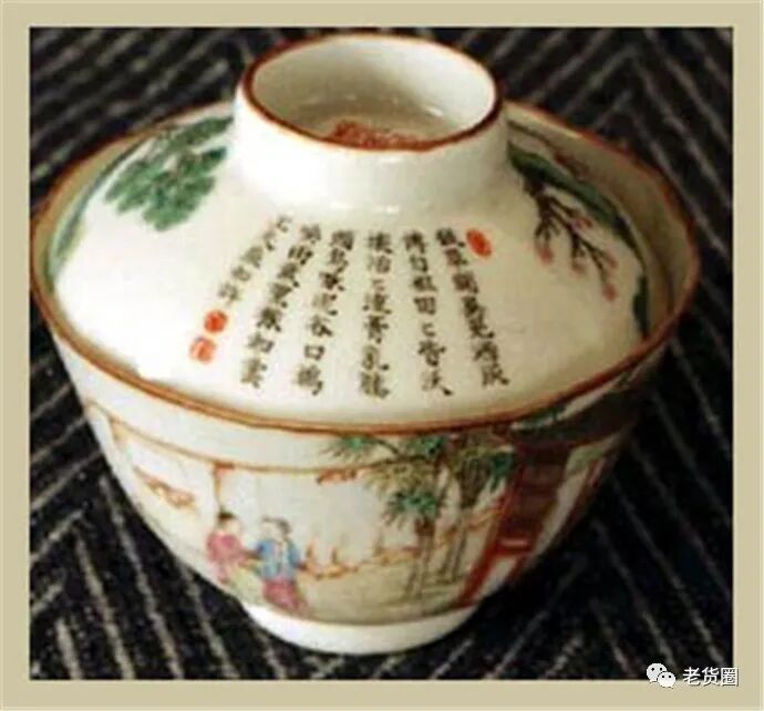 盖碗属于饮茶用具,饮茶是文人墨客的雅事。乾隆皇帝嗜茶,常作诗品茗,在许多陶瓷茶具上都留有乾隆帝的御题诗句。