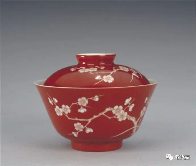 清道光 珊瑚红地白梅花纹盖碗
