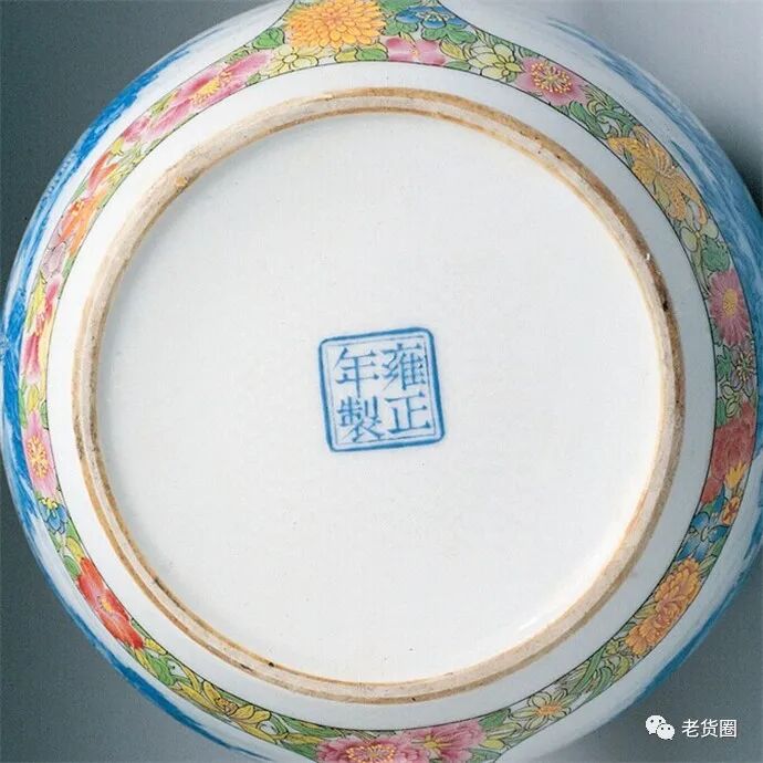 壶底蓝料书“雍正年制”二行四字仿宋体款字,外加双方框。雍正御用茶壶,喜爱简约大方造型,此类壶身较短,壶口略大的茶壶为雍正时期仿宜兴壶形制而作,单色釉如霁青、茶叶末珐琅彩瓷茶壶,均为相同造型。该件在道光十五年《珐琅、玻璃、宜兴、磁胎陈设档案》内名为“雍正