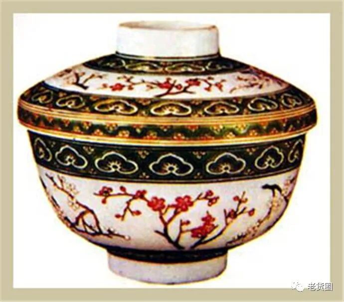 釉上粉彩绘梅花。粉彩瓷始创烧于清康熙时期,借助的是珐琅绘技法,至雍正以后,得到空前的发展。道光粉彩瓷虽不如雍正极盛时精致,但由于此时饮茶成为一种特别嗜好而风行于世,茶具的胎质、彩绘仍有特点。此盖茶碗, 造型隽秀,胎体薄轻,粉彩绘边饰图案和梅花画笔十分精细,风格上清秀柔和。