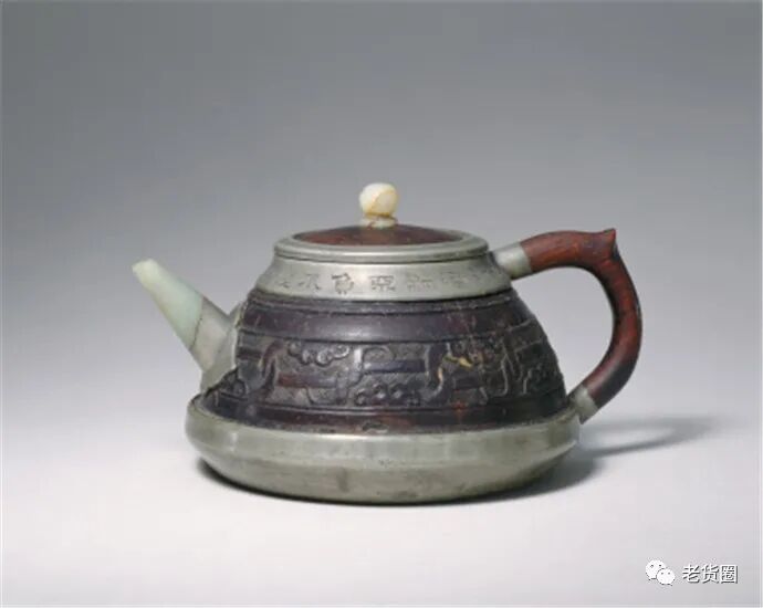 宜兴窑石楳款紫砂胎镶玉槟榔木壶,清道光,高9cm,口径6.5cm,底径12cm。