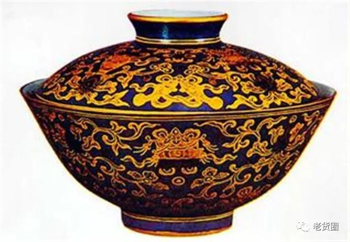 这件霁蓝釉盖茶碗,造型规整秀美,图案纹饰金银,描绘工细,盛世特征鲜明,给人以华贵侈靡的时代风尚。