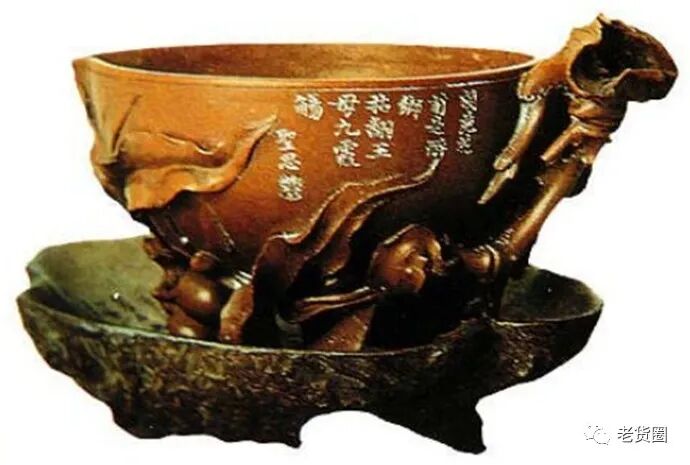 成了杯底的三个支撑点, 使桃形杯稳定在底座上,桃杯外沿下,还刻有“阆苑花前是醉乡, 拈翻王母九霞觞”诗句,