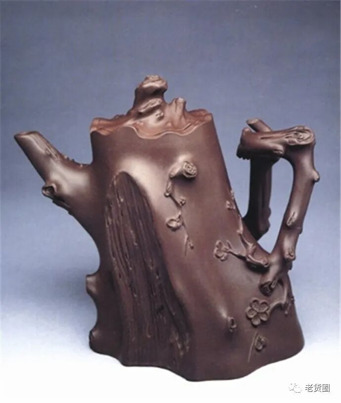 梅干壶系仿生型紫砂茶壶,因形似梅干而得名。它由壶身、壶嘴和壶把组成,从壶的整体看,这把壶成了一件强有力的雕塑作品。壶上梅花采用堆花手法,用有色泥浆堆积塑造成形。壶身犹如一段苍老古拙的梅桩,前倾,但由于上小下大,重心低,因此稳定性极好。而壶身两侧的壶嘴和壶把,似两根茁壮生长的短枝,伸展自然。整个造型,给人以一尊精工细刻的雕塑之感,堪称仿生壶中的佳作。至于作者采用梅干造型,是经过一番深思的。明·袁宏道有《梅花》诗曰: