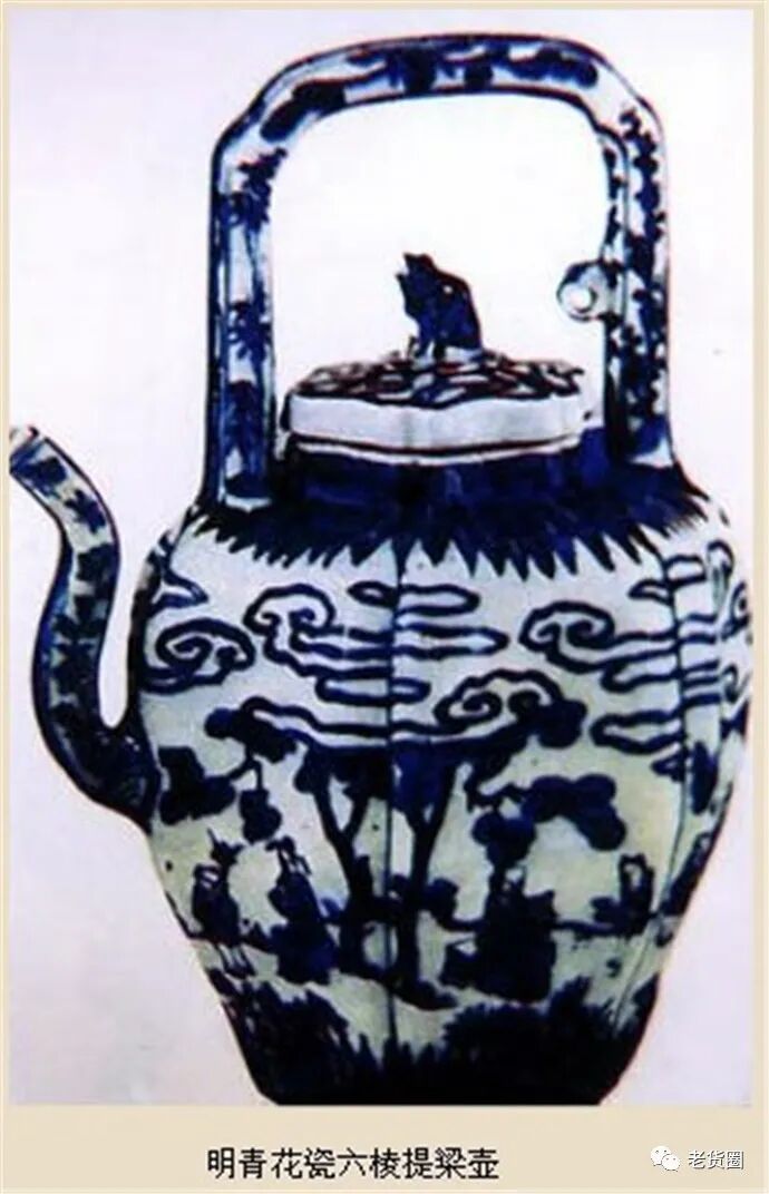 明青花瓷六棱提梁壶,纹饰布局较繁乱,云气纹、人物、松林及蕉叶纹等绘画风格繁缛麻密,幼稚滞拙。青花发色灰暗昏散。壶的造型为六棱瓣状,流和提梁呈方形,采用模具成型。纹饰、造型具有日本特色。这是因为在16世纪后期(