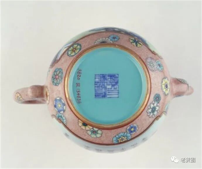 壶盖与底均有描金。壶底中心青花篆书“大清乾隆年制” 三行六字款。