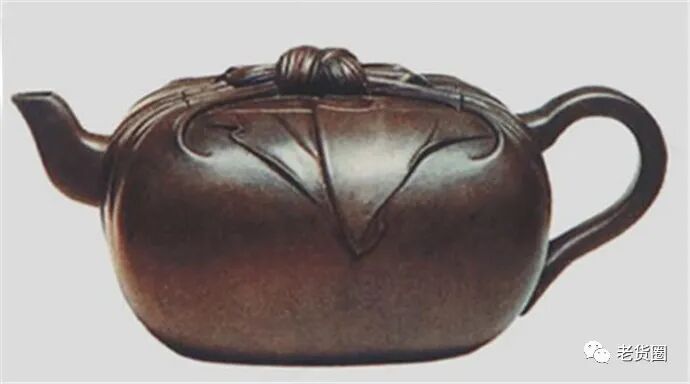 这件包袱壶通高9.7厘米。制作时作者将整个壶身处理成一个方中显圆的包袱状,继而,又将包袱布两边扭束成一条带,连接壶的嘴和把柄,而带中间的结又正好落在壶盖的中间,这样,结也就成了茶盖上的钮,显得贴切自然。在整把壶的上半部,还可见到包袱布的褶纹,线条十分流畅。壶的底部,刻有“两腋习习清风生,鸣远”字样,这里既道出了壶的制作者是鸣远(陈鸣远),又说明壶的功能所在,使壶更具文化品位。现该壶为美国佛立尔博物馆收藏。