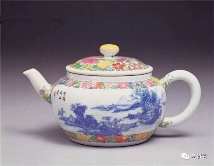 磁胎画珐琅青山水白地茶壶,壹件”。
