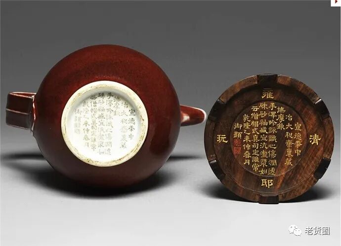 乾隆己卯(即公元1759年)御制”。边饰红彩蝙蝠纹。蝙蝠纹样,在民俗文化中,寓意“幸福”,这种装饰,在清代瓷绘中时有所见。特别是乾隆时,常把封建伦理和福禄寓意的画面用于瓷器上。
