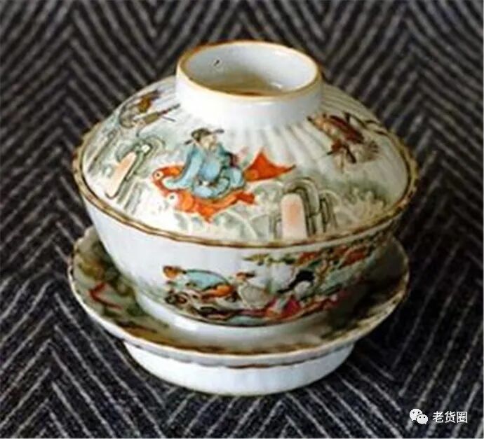 这件清同治粉彩瓷盖茶碗、托,绘人物,笔法稚拙。器型制作规范, 用模具成型工艺造型。釉面泛白、釉层匀净。有近代瓷器的风格特征。