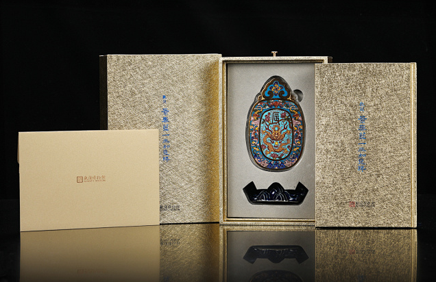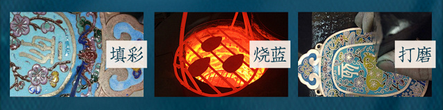 传承景泰蓝制作工艺,铜地掐丝,点蓝成翠,表面饰金。