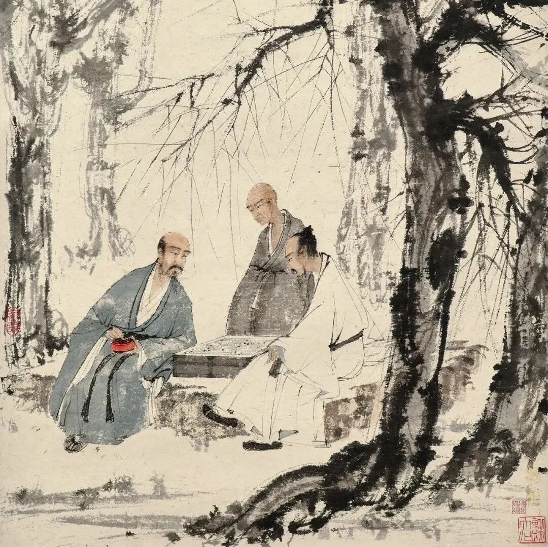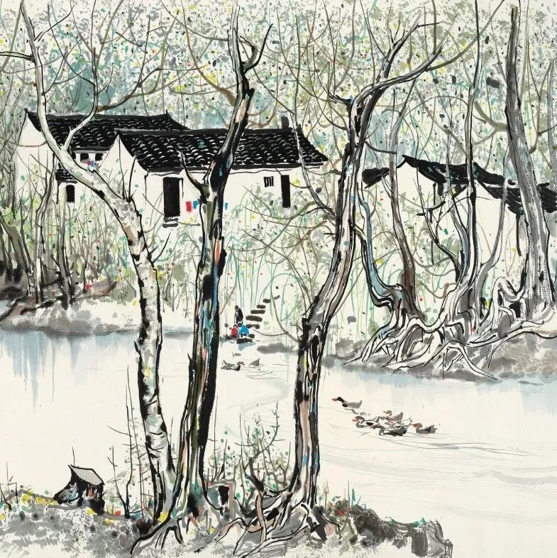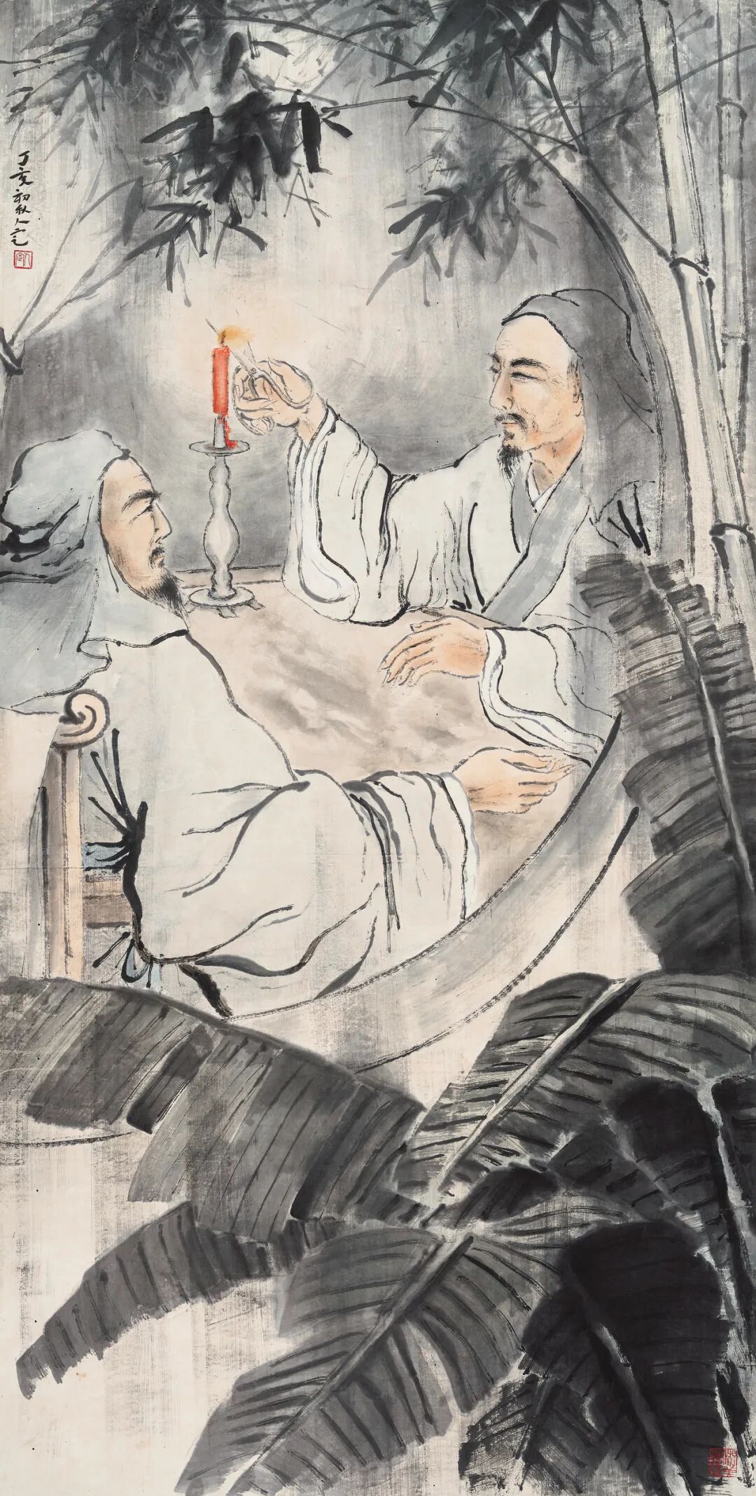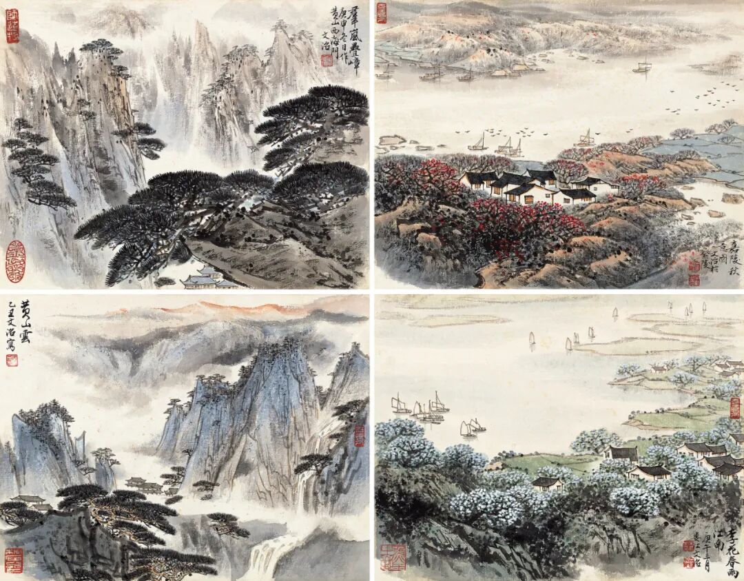 与新金陵同时,岭南画派亦因关山月、黎雄才、赵少昂、方人定等名家辈出而迅速崛起,号为新岭南画派,与高奇峰、高剑父等为代表的旧岭南相轩轾。关山月以写梅享誉天下,黎雄才则以画松独步一时。黎氏1982年作《深谷闻惊雷》绘数株苍松峭立于瀑泉危岩上,以层层积墨写出,山石则以小青绿精致勾勒,别开生面。同出《方人定画集》的《剪烛图》及《水上人家》,一出前人典故,绘两士于蕉窗晤谈夤夜,剪烛以续;一则写时人风俗,绘船家水上生活,皆栩栩如在眼前。