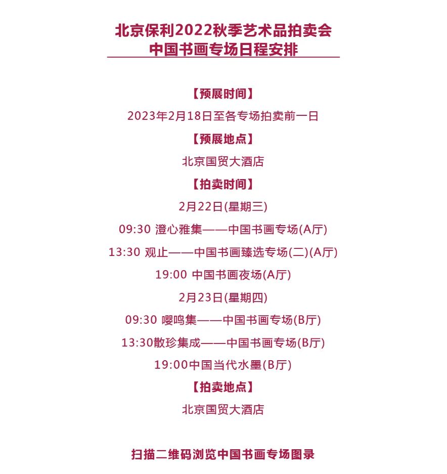 好饭不怕晚,良缘不惧迟。北京保利拍卖2022秋季艺术品拍卖会虽因故延迟至2023年2月举行,但精彩程度却绝不打折,其中中国书画部更毕半年之功于此役,共付拍千余件中国近现代大匠、巨笔及当代名家杰构,集结为中国书画夜场、澄心雅集、观止、嘤鸣集、散珍集成及中国当代水墨六大专场,势将为海内外诸贤达奉上一场精彩纷呈的艺术盛筵。