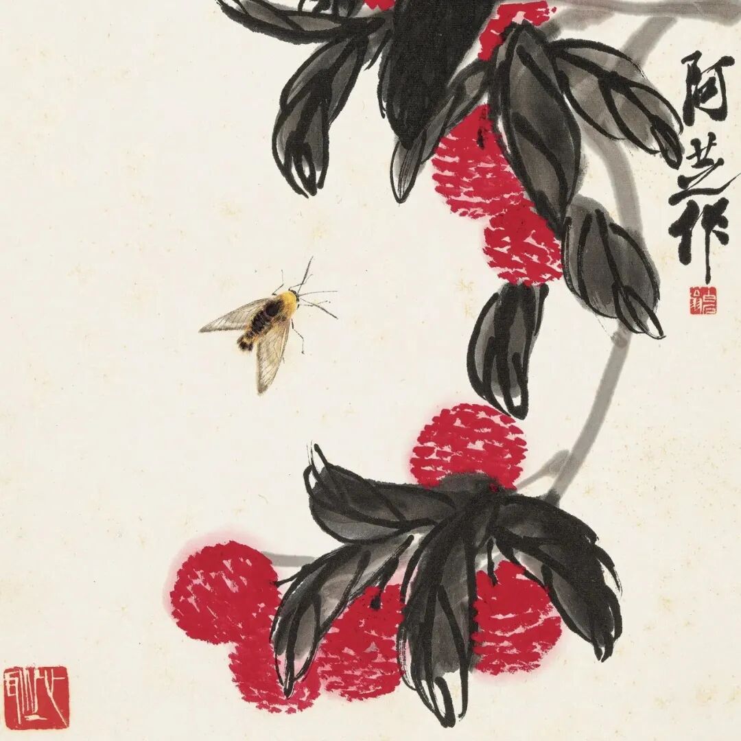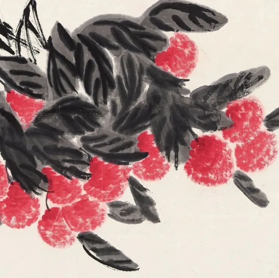 齐白石《富贵寿考》和《五子图》则一见湘潭人设色之清丽、一见其构图之独奇。前者以传统文化中象富贵之牡丹与寓长寿之绶带入画,兼施洋红、花青、藤黄诸种色彩,而不见俗意;后者绘一雄鸡怒冠张羽奋爪梗脖横立画幅之中,又以水墨缀数枚雏鸡,使上下气息沟通流转,造险破险不过瞬息之间,具见其造化神功。