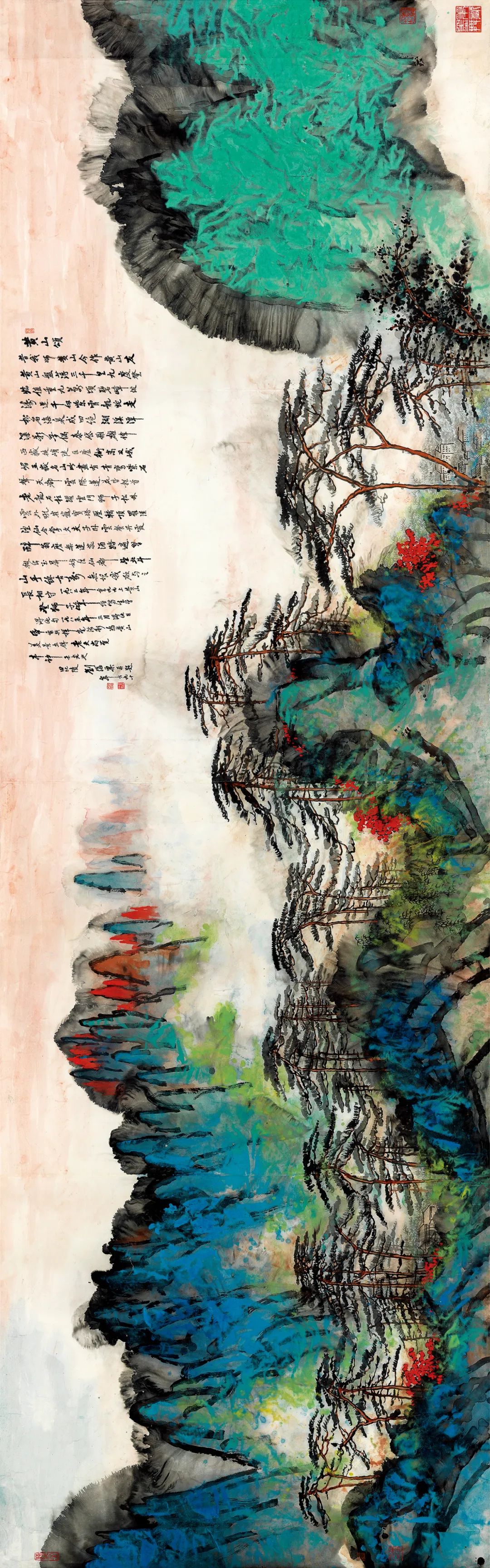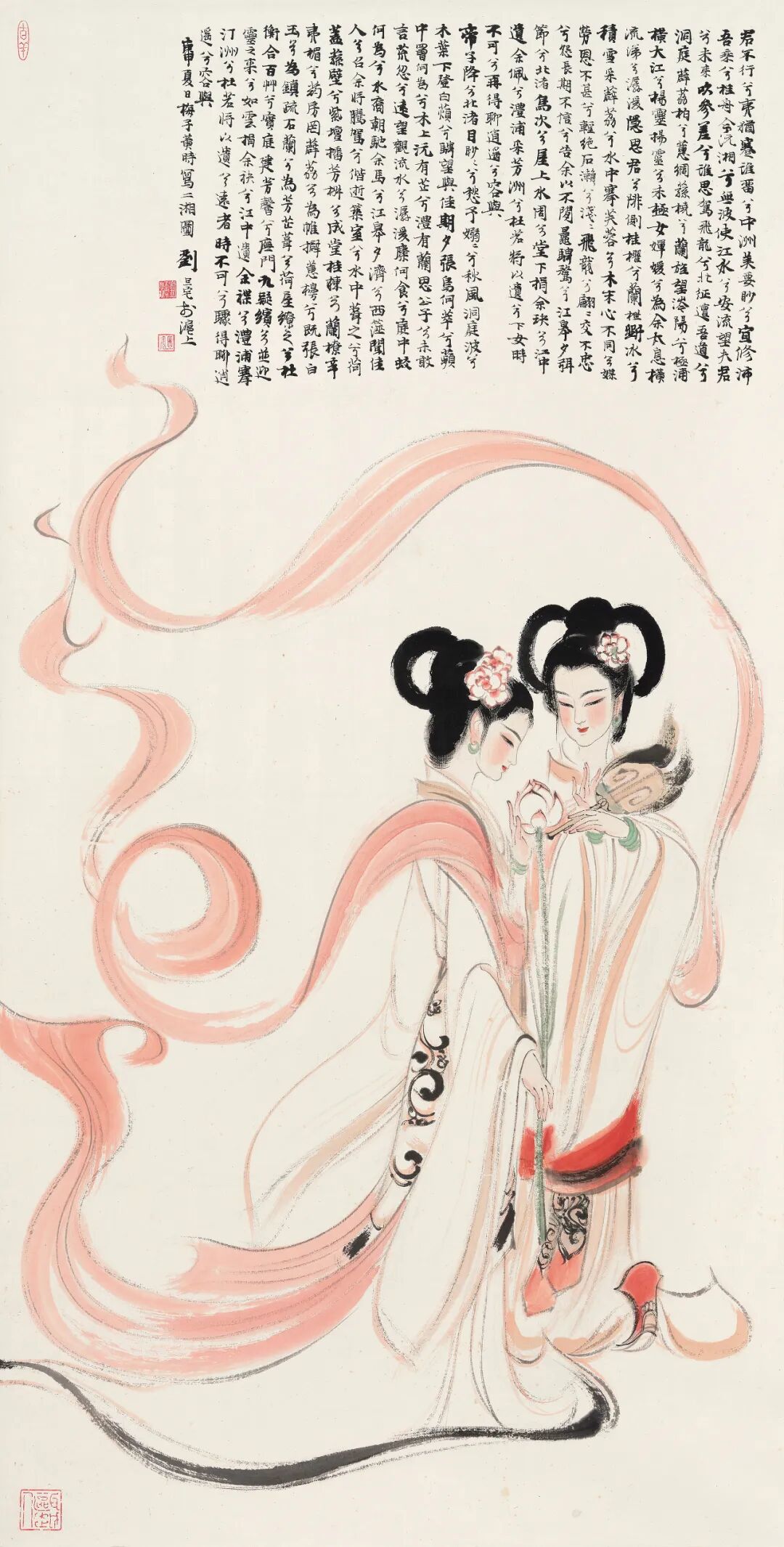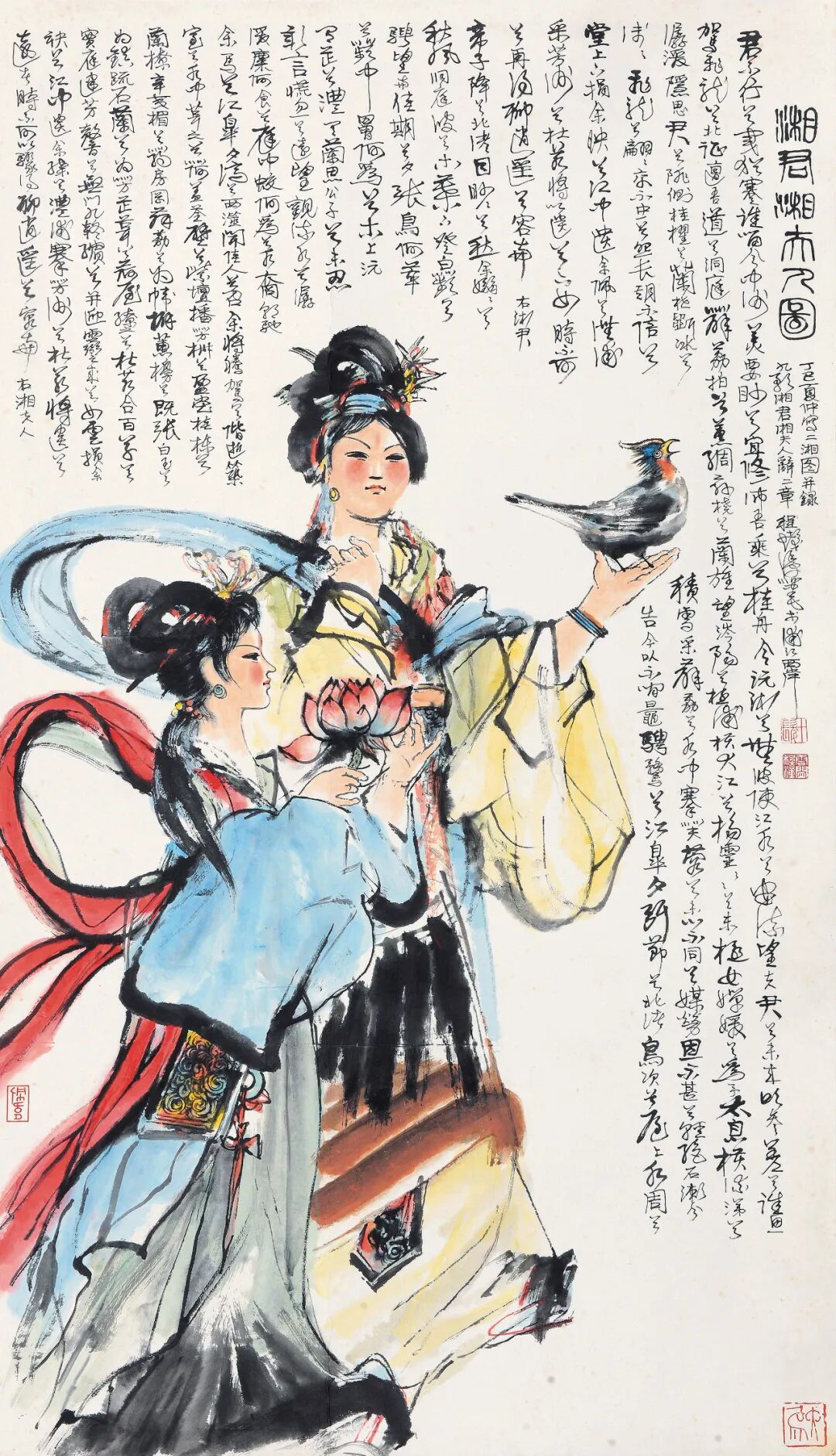 【题识】君不行兮夷犹,蹇谁留兮中洲?美要眇兮宜修,沛吾乘兮桂舟。令沅湘兮无波,使江水兮安流!望夫君兮未来,吹参差兮谁思?驾飞龙兮北征,邅吾道兮洞庭。薜荔柏佤兮蕙绸,荪桡兮兰旌。望涔阳兮极浦,横大江兮扬灵。扬灵兮未极,女婵媛兮为余太息。横流涕兮潺湲,隐思君兮陫侧。桂棹兮兰枻,斫冰兮积雪。采薜荔兮水中,搴芙蓉兮木末。心不同兮媒劳,恩不甚兮轻绝。石濑兮浅浅,飞龙兮翩翩。交不忠兮怨长,期不信兮告余以不闲。朝骋骛兮江皋,夕弭节兮北渚。鸟次兮屋上,水周兮堂下。捐余玦兮江中,遗余佩兮澧浦。采芳兮杜若,将以遗兮下女。时不可兮再得,聊逍遥兮容与。庚申夏日,梅子黄时,写二湘图,刘旦宅于沪上。吴湖帆之外,正统海派首推武进谢稚柳。壮暮翁天赋极高,又与张大千等游,眼界自高,下笔亦自不俗,尤以1970年代罹患眼疾之前所作小工笔仕女、花鸟、山水最为出彩。1962年作《绿柳鸣禽》绘一羽鸜鹆踞于柳枝,柳丝轻扬,桃瓣缤纷,皆以工笔写就,颇有宋意。此外,云间程十发亦逞才气,创作出一种独有的笔墨语言和形象体系,丰富了后海派的艺术图谱。其实程氏1949年前皆依违古法、固守前人圭臬,仿古之造诣堪称独步。此后或因连环画之关系,书画风格皆为之一变,线条笔划皆极具弹性而凝练,尤重提点按压抑扬顿挫之节律。丁巳所作《二湘图》及《周勃像》,皆此种风格之大成。又1988年作《听笛图》更进一步,对细节的关注更罕,而径以大笔刷出,回归稚拙天真。一生在与徐悲鸿纠缠不清的刘海粟,亦是后海派的代表性艺术家。刘氏重气,不拘成法,面貌独具,尤以巨幅泼写胸中丘壑豪饮时誉;1970年代后期又开始尝试泼墨泼彩之法,多以黄山及荷花为题材,尺幅巨大,兼敷色艳冶,气势雄壮,逼人而来。署为1982年作《荷花鸳鸯》 及1985年作《黄山颂》即均以巨幅泼彩成之,气魄独具,豪情横溢。