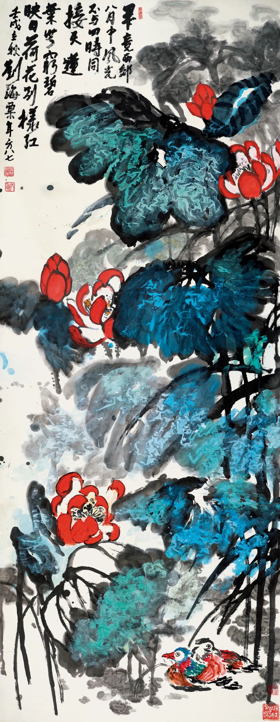 估价:RMB 2,800,000-3,800,000【题识】毕竟西郊八月中,风光不与四时同。接天莲叶无穷碧,映日荷花别样红。壬戌立秋,刘海粟年方八七。【印文】海粟长寿、美在斯、静远堂、十里荷花、存天戏海之楼