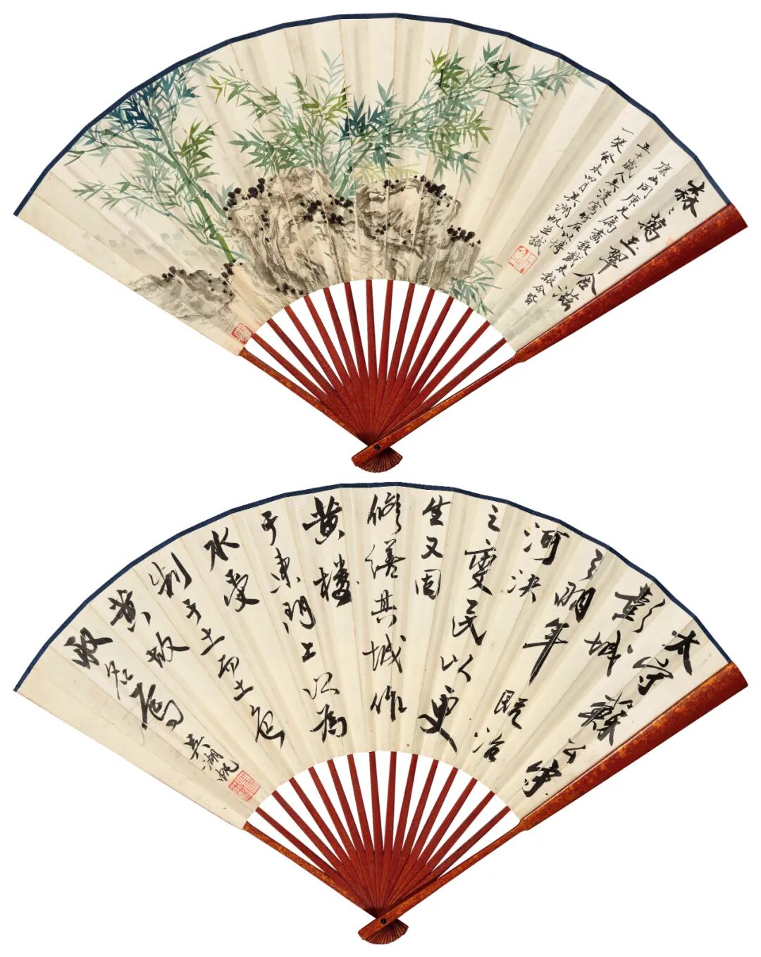 1.森森万玉翠含滋。康山同庚兄属画,数载未报,今皆五十岁人矣。漫写竹石以博一笑。癸未四月,吴湖帆并识。2.太守苏公守彭城之,明年既治河决之变,民以更生又固修缮,其城作黄楼于东门上,以为水受制于土,而土色黄,故取名焉。吴湖帆。