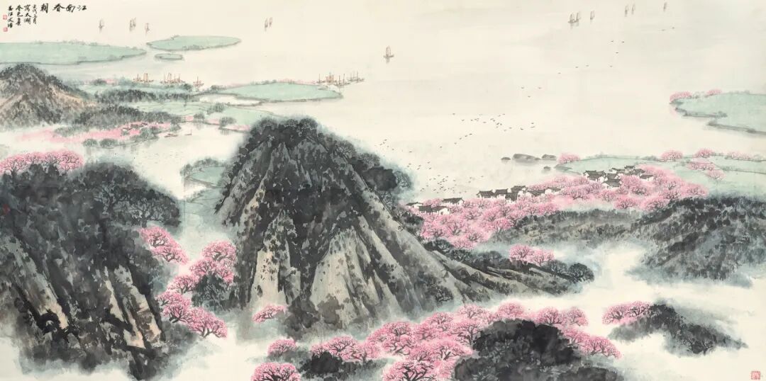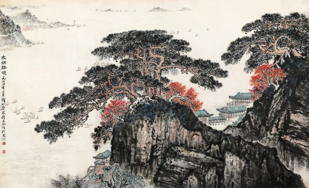 估价:RMB 1,800,000-2,200,000【出版】《银座美术馆馆藏作品选集》第42-43页,银座美术馆(济南),2007年。傅抱石、钱松岩领导的新金陵画派亦脱胎现代海派而更发扬之,尤其经傅抱石等人倡导而践行之“二万三千里写生”之长征后,新金陵画派以“为河山立传”的决然之姿跃上现代画坛之巅,与现代海派、京津鼎立一时。其中傅抱石更创散锋法及抱石皴,傲然屹立;钱松岩则以精擅之松、岩驰名。1973年为南京机场候机大厅所作巨幅《太湖盛景》,以平远法绘太湖一角,苍松兀立,危石壁张,屋宇处处,舟帆点点,一派时代新气象。又宋文治《江山如画》四屏,以太湖、黄山、嘉陵等地四时景色入画,颇有咫尺天涯之妙。