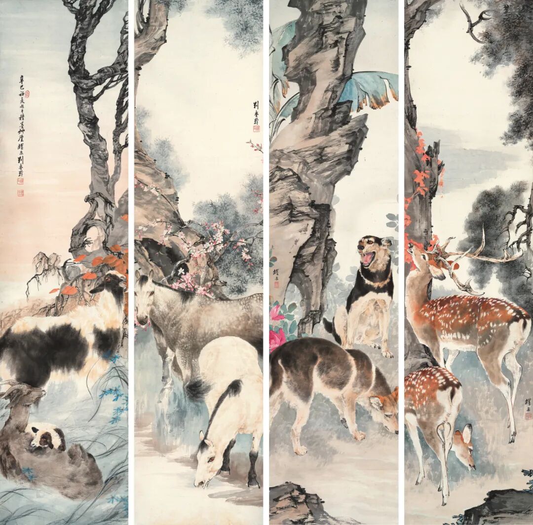 陈半丁继金拱北而为前齐白石时代的京津画派盟主,一时风头无两。由其家属直接提供的巨幅《富贵牡丹》,绘巨石牡丹,缀以芭蕉两树,气息开张,笔墨精到,显非凡品。与陈氏几乎同时而执沽上艺坛牛耳的刘奎龄,则以翎毛走兽擅名,开一代风气,徐悲鸿曾推为“当代中国画坛翎毛第一人”。1945年作《动物六屏》即此中翘楚,六屏分绘双狗、双羊、双猴、双狐诸种,辅以锦葵、芦苇、苍松等场景,精彩纷呈。