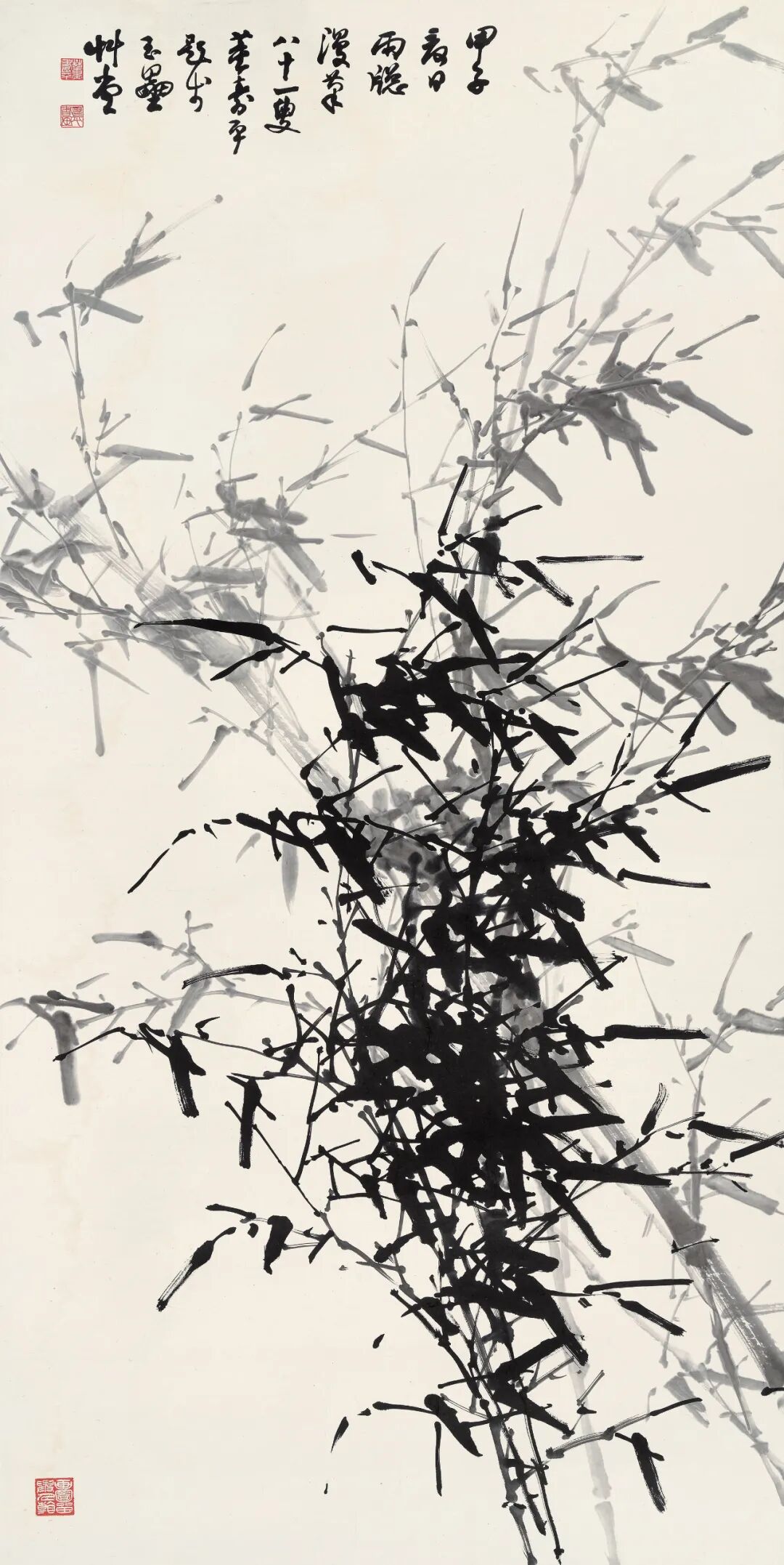 从经济学跨界至书画的董寿平当是京津画派中独立成家的惟一一人,其作曾于21世纪初成为山西省的硬通货币。董氏人品高洁,以画梅竹松专名,山水则继石涛诸人后复称黄山巨擘。经故宫张效彬转赠印尼侨领黄凯露的《春山松瀑》即以浅绛加小青绿模写黄山胜景一角,烟云满纸,极为罕见。1984年作《墨竹》,以水墨绘丛竹经雨,任意涂抹而成文章。