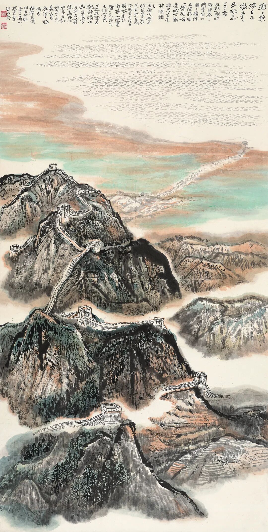 石鲁、赵望云及何海霞及方济众、黄胄等则立足西安,一手传统,一手生活,竟成长安画派,于现代中国画坛分一杯羹。其中何海霞转益多师,早年仿古,又拜张大千门下,同时吸收长安本土特色,卓然成家。1978年山海关游后所作《山海关》,取角独特,颇具曹孟德“水何澹澹,山岛竦峙”之豪情。