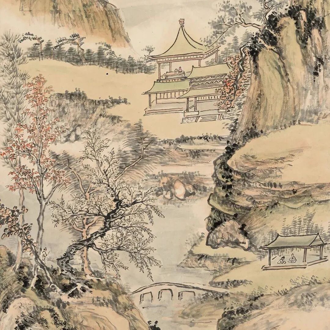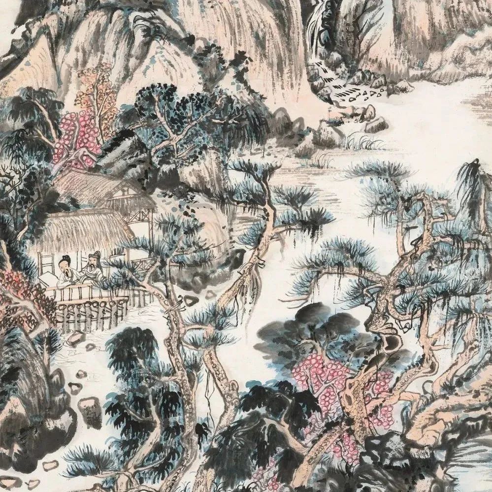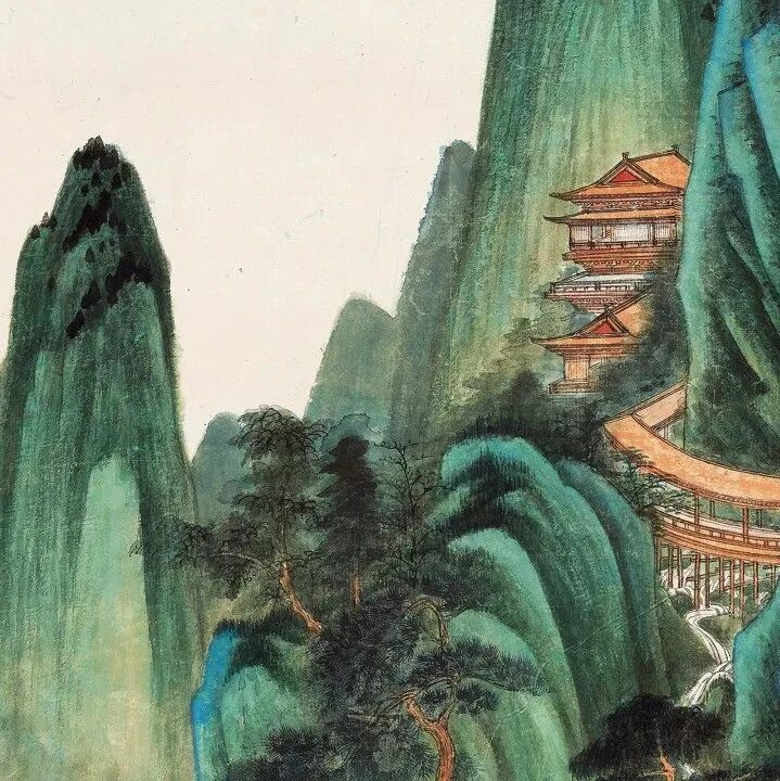 “海派”及后“海派”,与吴昌硕师友之间者及出吴氏门下者,及至新时期之“新海派”,名家巨笔均代有其人且不知凡几。前者如山阴人任伯年,后者如王一亭、吴湖帆、谢稚柳等。任伯年继赵之谦等为海派领袖,同时兼受西方艺术及商业社会冲击,夹缝求生,而极逞才情,创所谓“钉头鼠尾”线法,以巨笔横扫,挽传统书画于将倾。1887年作《三羊开泰》系其晚岁走兽题材佳制,绘苇丛旁三羊于日影里首尾相顾,敷色极淡冶,苇丛以没骨勾出,日影则以淡红涂成,氤氲朦胧,颇含无尽意。吴缶翁名耸中外,门下汲汲。吴湖帆因吴昌硕曾宾其祖吴大澂幕而与旧识,算是半个学生,后竟继踵缶翁而成后海派领袖。丑簃天潢贵胄,少时即承庭训,又饱览乃祖旧藏,于宋元名迹多有会心,故笔下所出,尤多古意,尤其己丑岁前。署为1938年所作《仙山楼阁》即法赵松雪之细笔青绿杰构,绘春山无尽,瀑泉有声,而松壑高隐,一派堂皇天真。![]()