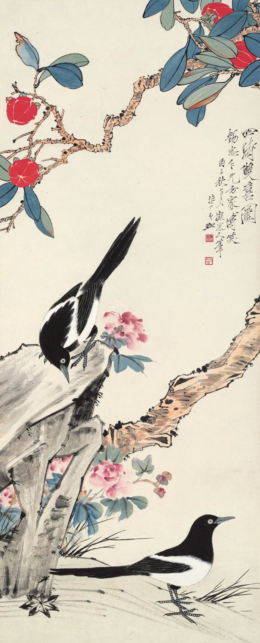 【题识】四时双喜图。锡忠仁兄方家博笑,丙子秋七月拟宋人笔。非闇弟照。1.上款人夏锡忠(1892-?),北京海淀六郎庄人,民国北京琉璃厂有名的古董商、金石鉴定大家、「清和斋」主人。1939年买入张勋府邸,成为当时北京最大的古董商。1954年曾将一件牙雕魁星捐给故宫博物院。2.LOT2821-2830为重要机构委托,请买受人于拍卖结束后一个月内完成结算相关事宜。具体情况请咨询相关工作人员。