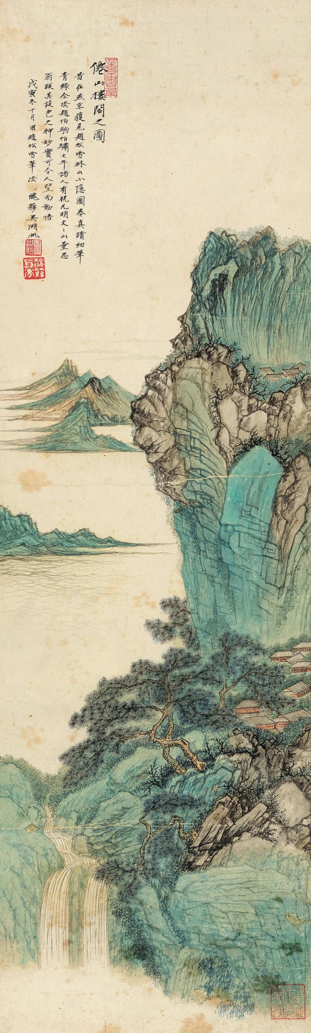 【题识】昔在燕京获见赵松雪《林山小隐》图卷真迹,细笔青绿。全法赵伯驹、伯骕大年诸人,有祝允明、文文山、董思翁跋其设色之神妙,实可令人望而动悟。戊寅冬十月用赵松雪笔法,丑簃吴湖帆。