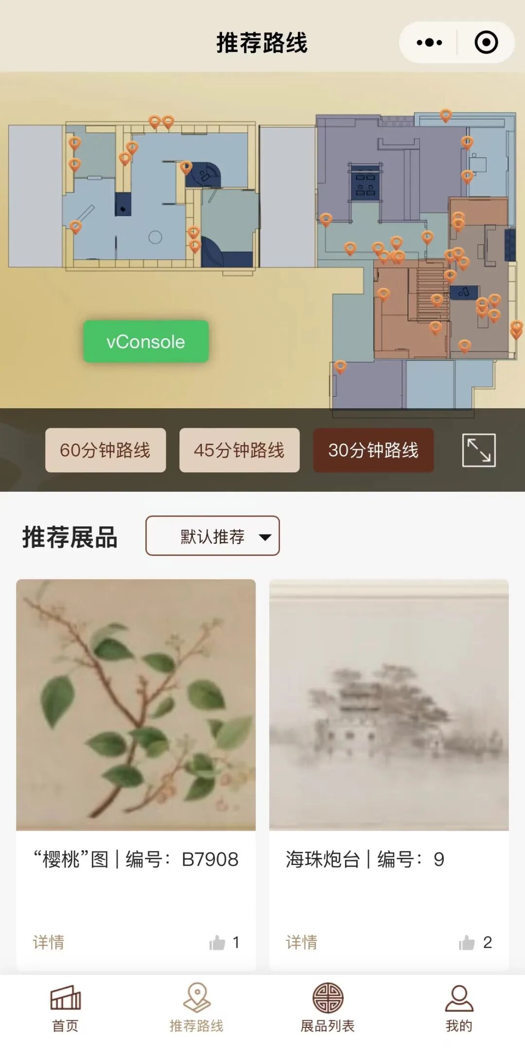 在首页上,智慧导览会根据您的偏好,推荐您可能喜欢的展品、展览路线和内容。您可点击观看展品详情,点赞您喜爱的作品。导览还会根据您的观展时间推荐参观路线,方便您在计划的时间内都能看到心仪的展品。