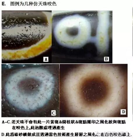 但是对于风化纹之判别需要非常小心注意,然而现代的切割工具亦能呈自然而不规则状之对称沟槽纹路,而仿制天珠风化纹就有如用刀子在叶子上划一刀一样其内部沟槽呈整齐之V字形一般,然而有些老天珠的风化纹并不一定是非常的明显.