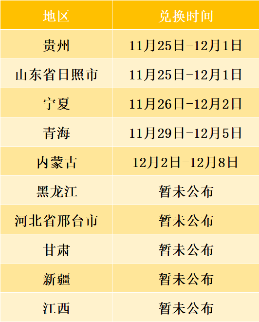 截止目前,贵州省、山东省日照市、宁夏、青海省及内蒙古,公布了具体兑换时间: