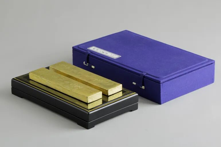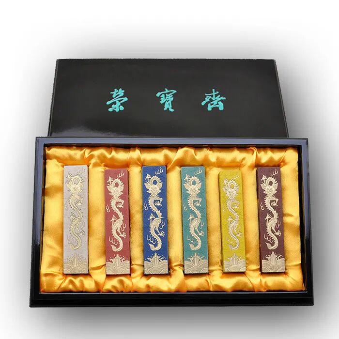百年包金套墨为荣宝斋于上世纪八十年代委托屯溪老胡开文墨厂(旧称国营徽州墨厂)定制,一面为启功先生题写的“荣宝斋百岁之庆 启功题颂”并由兰草底纹,另一面为双龙纹样。顶识“超细油烟”,侧款“屯溪胡开文墨厂”。一套两锭,内盒为黑色漆盒,外盒为蓝布盒。