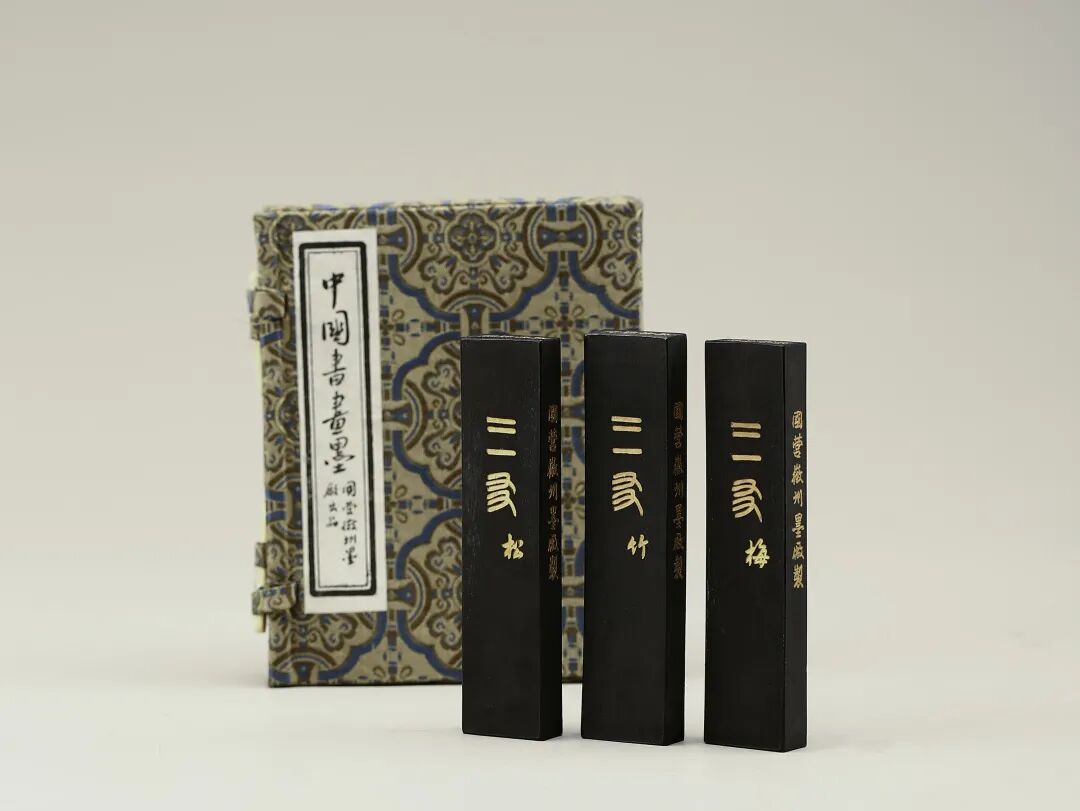 三友套墨为荣宝斋于上世纪八十年代委托屯溪老胡开文墨厂(旧称国营徽州墨厂)定制,一面分别绘有松竹梅图案,描金填彩,另一面写有“三友 松”、“三友 竹”、“三友 梅”。顶识“超顶漆烟”,侧款“荣宝斋定制”、“国营徽州墨厂制”,每套三锭。