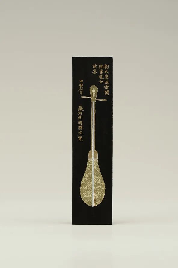 枕雷阁图,系荣宝斋库存旧墨,歙县老胡开文墨厂在上世纪八十年代生产。一面为清代画家顾麟士的《枕雷阁图》,题有款识“枕雷阁图 顾麟士写”,山峦及树木双色描金,林中小屋门窗墙面等位置填银,另一面为一忽雷琵琶,题有款识“刘氏双忽雷阁 枕雷道士造墨 甲寅九月 徽州老胡开文制”,顶识“超漆烟”,墨版清晰,填金细致,侧款“徽歙老胡开文墨厂制”。