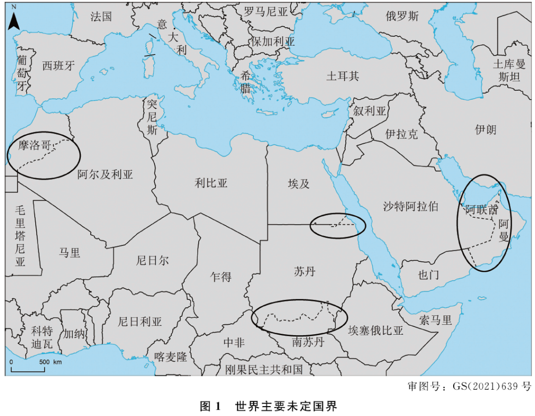 图1共存在6组未定国界:摩洛哥-阿尔及利亚、阿联酋-阿曼、阿曼-沙特阿拉伯、阿联酋-沙特阿拉伯、苏丹-南苏丹、埃及-苏丹。绘制公开世界地图时,应准确绘制上述未定国界。