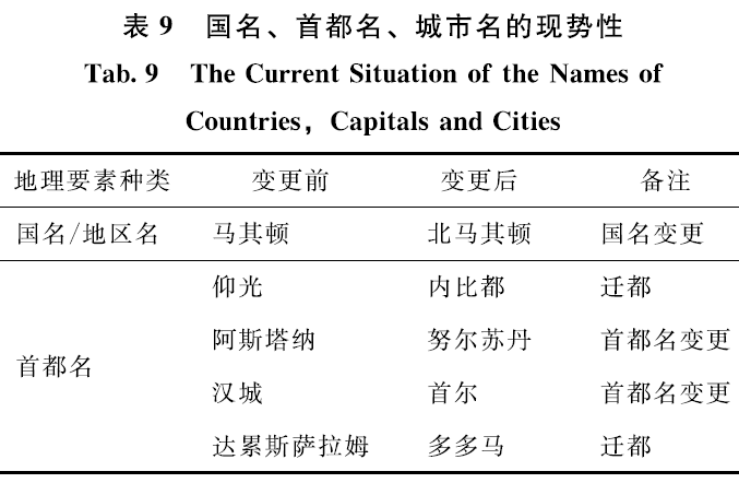 1)国名和居民地名称的现势性。公开地图应根据现势性正确表示国名、首都名、城市名等地理要素,如表9所示。