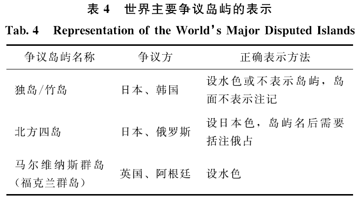 1)世界主要争议岛屿。根据世界各国国界线画法参考样图,结合实际工作,归纳出世界主要争议岛屿,如表4所示。