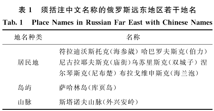2)俄罗斯远东地区若干地名。表示俄罗斯远东地区的若干地名时,除汉语拼音版地图和外文版地图,需要在俄文音译地名后括注其中文名称,如表1所示。